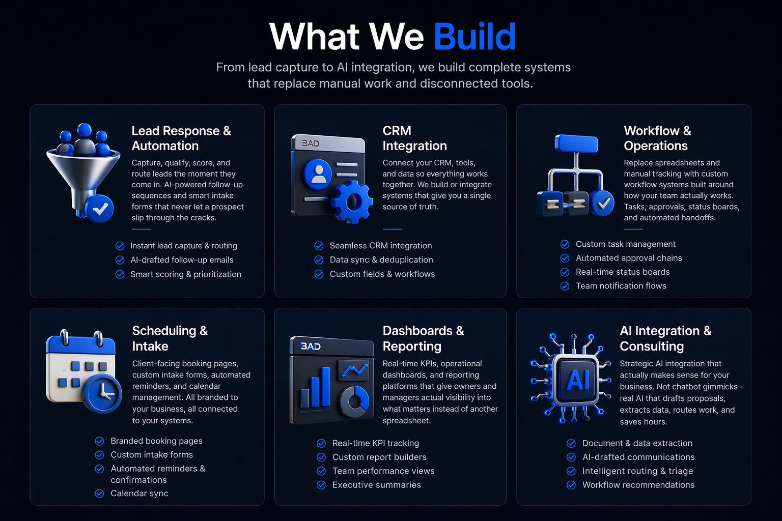 From lead capture to AI integration, we build complete systems that replace manual work and disconnected tools.